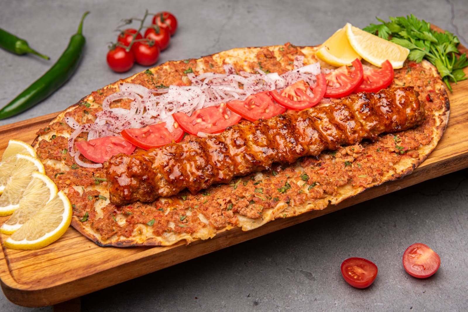 Juicy tender meat, marinated tomatoes,exotic turkish spices.